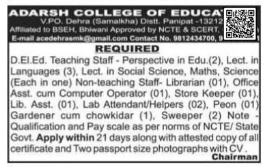 Adarsh College Of Education Panipat Vacancy 2026 Important Link