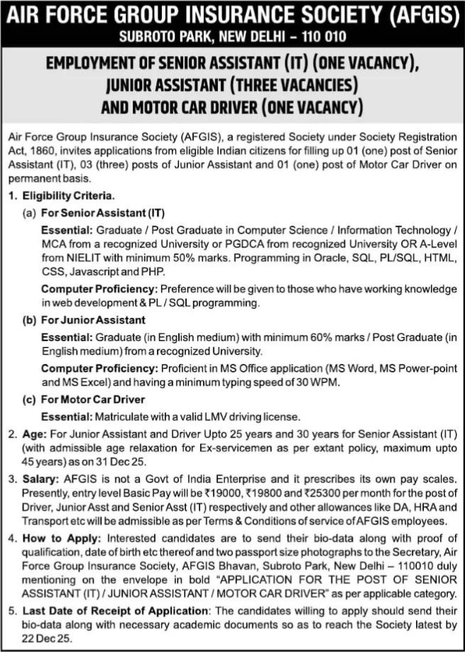 Air Force Group Insurance Society (AFGIS) has recently posted job openings for Junior Assistant, Sr Assistant and Motor Car Driver.. Online applications for the AFGIS Vacancy 2025 will be accepted starting 4 December, 2025, on the official website (iafpensioners.gov.in). If you are interested in this position and meet all the requirements, please submit your application.