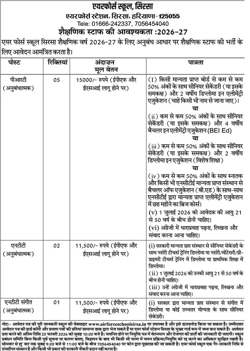 Air Force School, Sirsa (Haryana) has recently posted job openings for Teaching Staff (PRT, NTT). Online applications for the Air Force School Sirsa Vacancy 2026 will be accepted starting 11 February, 2026, on the official website (airforceschoolsirsa.in). If you are interested in this position and meet all the requirements, please submit your application.