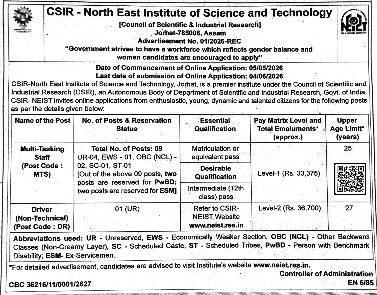CSIR NEIST MTS and Driver Recruitment 2026 Online Form