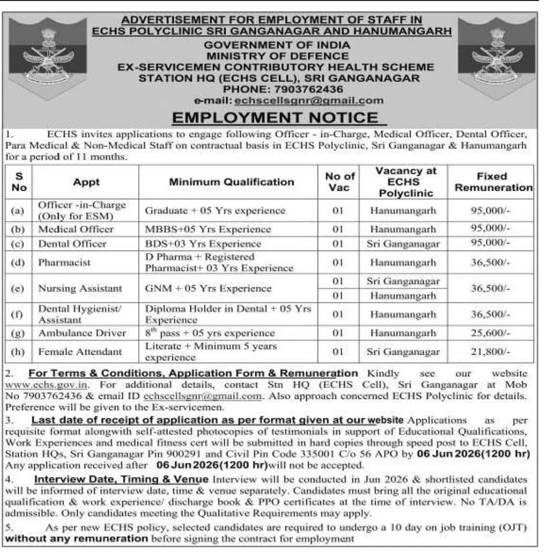 This article provides important information about the ECHS Sri Ganganagar recruitment process for 2026. For requirements eligibility, the selection procedure, and deadlines, please refer to the job posting published by the relevant department.