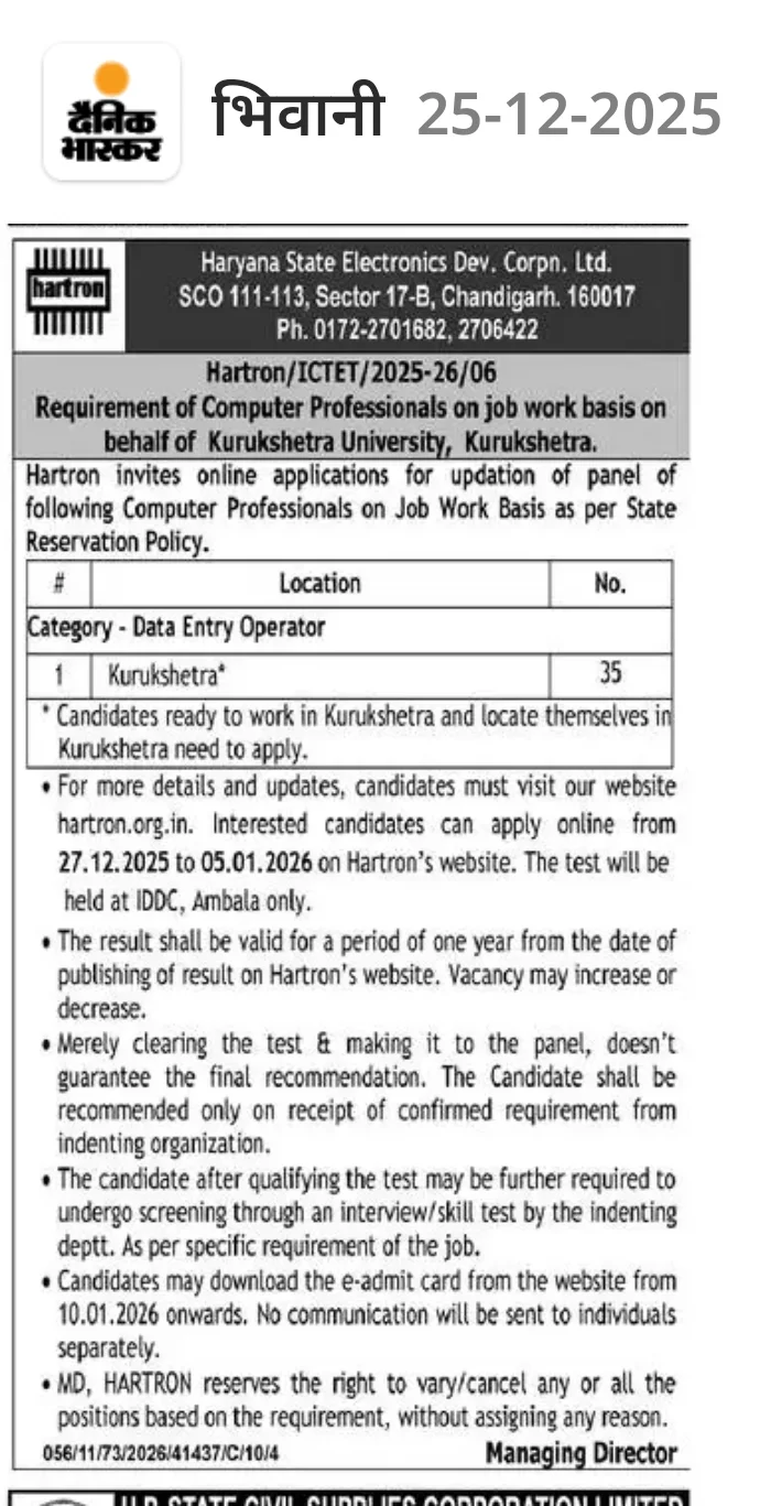 Haryana State Electronics Development Corporation Ltd. has recently posted job openings for Data Entry Operator (DEO). Online applications for the Hartron DEO Vacancy 2026 will be accepted starting 27 December 2025, on the official website (hartronservices.com). If you are interested in this position and meet all the requirements, please submit your application.
