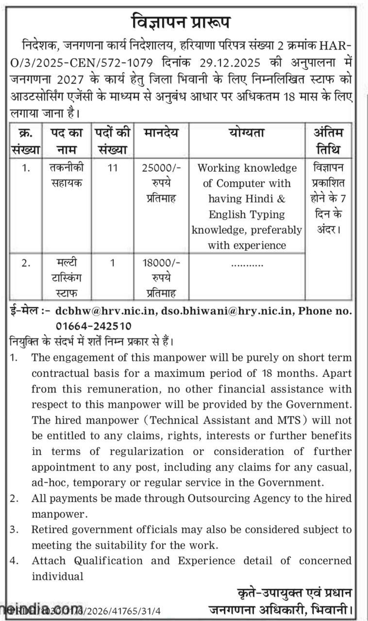 Haryana Census Operations Directorate, BHIWANI has recently posted job openings for Multi Tasking Staff (MTS) & Technical Assistant. Online applications for the Haryana Census Department Vacancy 2026 will be accepted starting 6 January, 2026, on the official website. If you are interested in this position and meet all the requirements, please submit your application.
