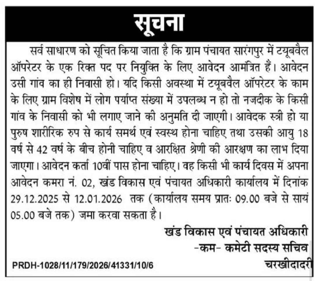 Haryana Tubewell Operator Vacancy Notification 2025 Overview
