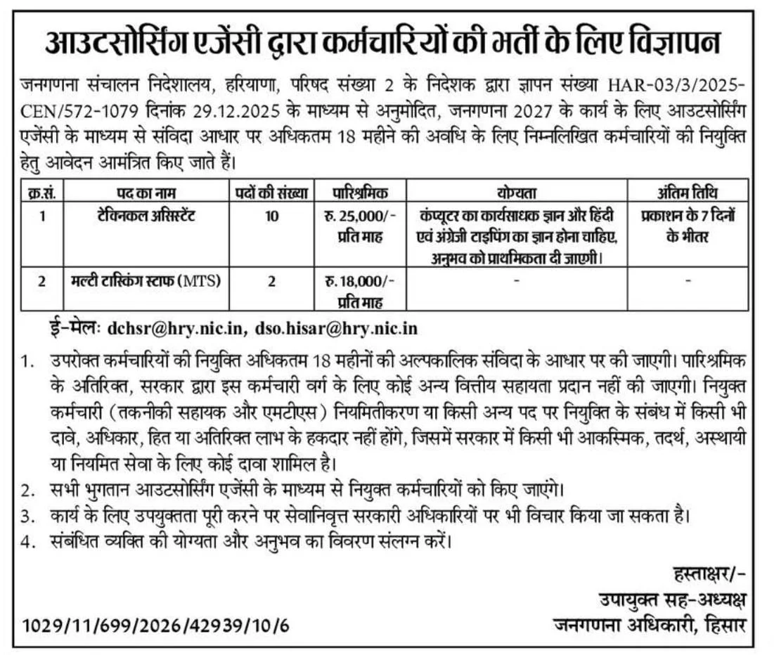 Specific criteria and procedures have been established for Hisar Census Department Vacancy 2026 selection process. Please follow the steps below.