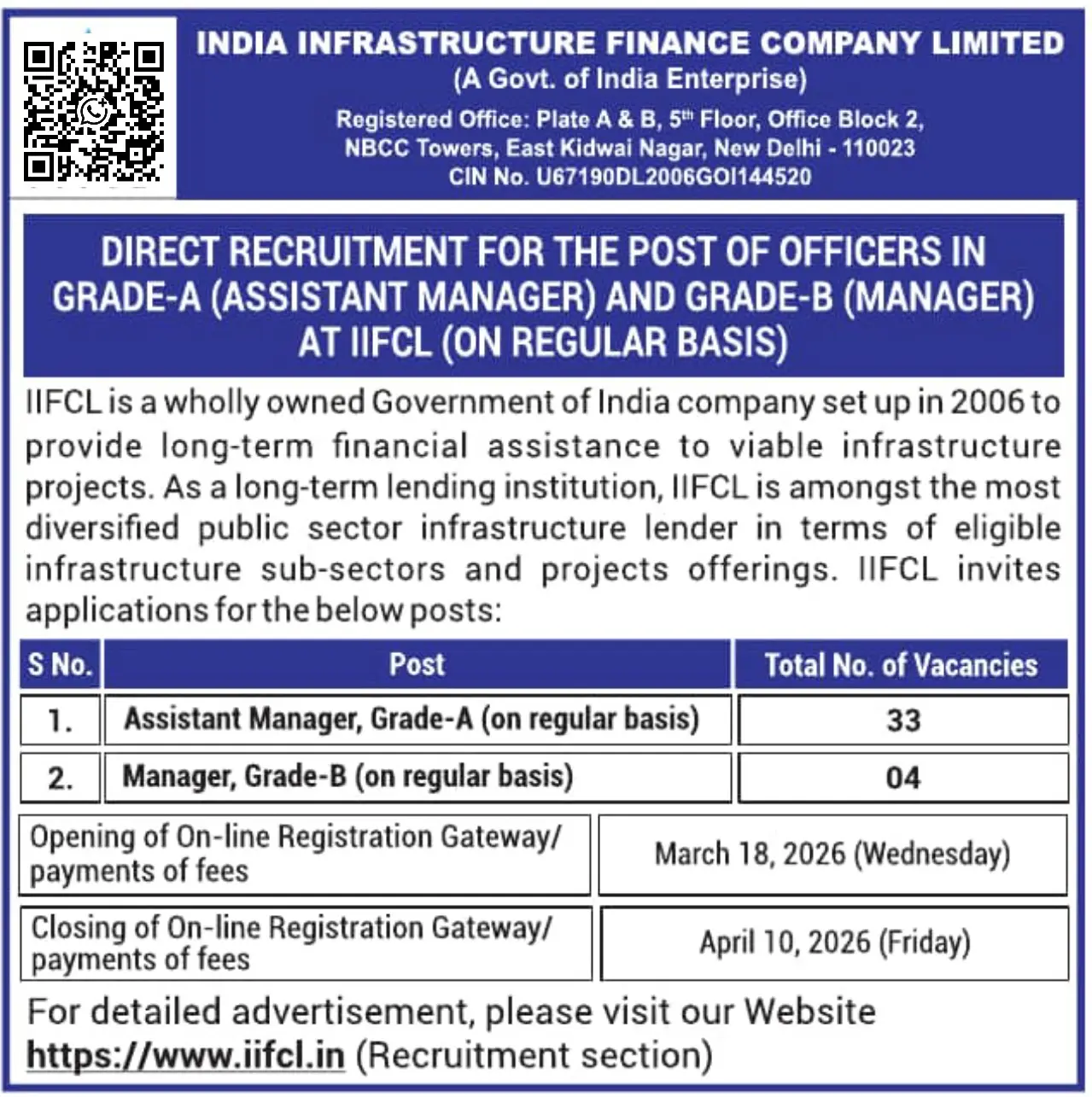 Recruitment Advt. No.Advt. No. IIFCL Vacancy 2026