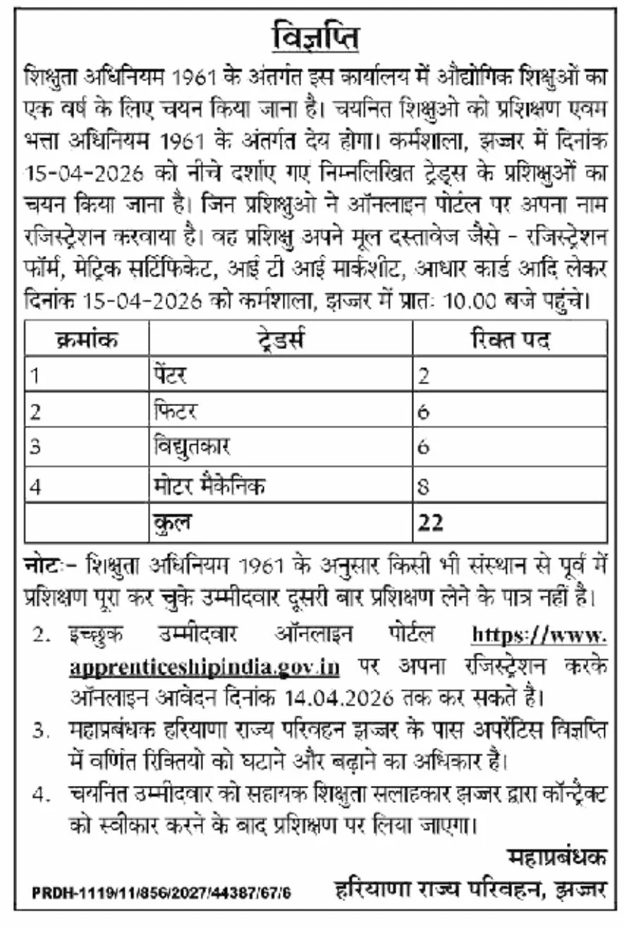 Haryana Roadways (Jhajjar) General Manager has recently posted job openings for Apprentice. Online applications for the Jhajjar Roadways Apprentice Vacancy 2026 will be accepted starting 04 April 2026, on the official website (apprenticeshipindia.gov.in). If you are interested in this position and meet all the requirements, please submit your application.