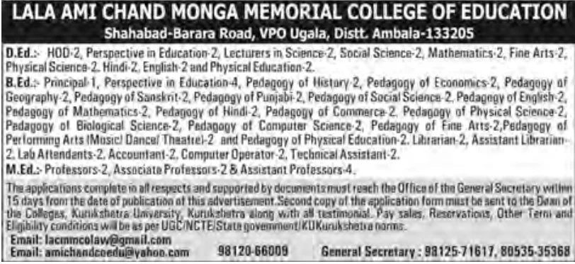 - Send the complete application form to the following address: Lala Ami Chand Monga Memorial College of Education Shahabad-Barara Road, VPO Ugala, Distt. Ambala – 133205