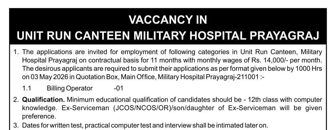 Unit Run Canteen, Military Hospital, Prayagraj has recently posted job openings for Billing Operator. Online applications for the Military Hospital Prayagraj Vacancy 2026 will be accepted starting 24 April, 2026, on the official website. If you are interested in this position and meet all the requirements, please submit your application.