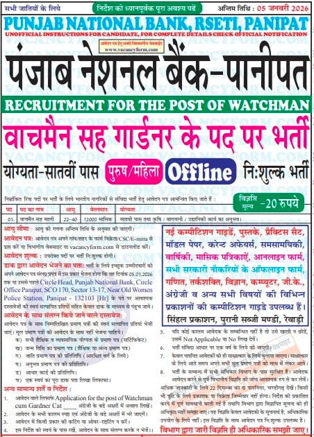 Punjab National Bank’s Rural Self Employment Training Institute, Panipat has recently posted job openings for Watchman cum Gardener. Online applications for the PNB Bank Panipat Vacancy 2025 will be accepted starting 23 December, 2025, on the official website. If you are interested in this position and meet all the requirements, please submit your application.
