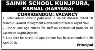 - Send application to: Principal, Sainik School Kunjpura, Karnal (Haryana) – 132023